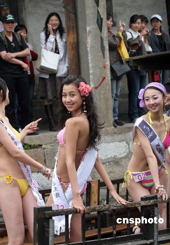四月十四日,参加二零零七国际旅游小姐中国区总决赛的三十八位佳丽首次亮相浙江古镇西塘。身着比基尼的佳丽们乘船游览西塘时,受到众多游客的喝彩。中新社发 刘鹰 摄