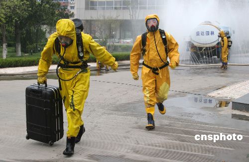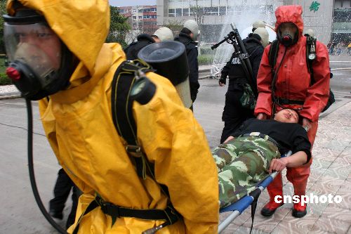 4月15日,江苏连云港举行“钟山--2007”液氯泄漏反恐预习演练,针对恐怖分子在某公共场所设置液氯泄漏恐怖事件,连云港公安部门紧急调动公安、消防、武警、卫生、环保等十七家单位、200多人赶赴现场紧急救援,最后成功处置了这起液氯泄漏恐怖事件。中新社发 穆道勇 摄