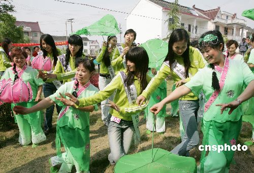 参加国际旅游小姐大赛中国区总决赛的选手四月十六日在浙江古镇西塘举行“旅游小姐最喜爱的西塘”活动,向当地农民学唱嘉善田歌,与农民们一起“种文化”,使春日的江南农庄充满欢笑与活力。中新社发 毛建军 摄
