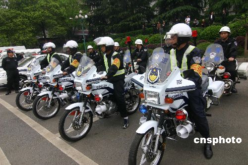 4月16日,参加娄底城区机动化治安巡逻首巡仪式的武警官兵整装待发。当日,湖南娄底市召开娄底城区打击“两抢一盗”动员大会,数百名武警、公安、治安巡逻队员举行了机动化治安巡逻首巡仪式。中新社发 郭国权 摄