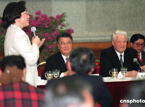 邓小平女儿萧榕一九九六年四月二十五日在北京钓鱼台国宾馆欢迎酒会上,应叶利钦总统要求就两国文化交流提问,叶利钦对此作了圆满回答。中新社发 贾国荣 摄