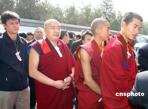 图为前来吊唁的喇嘛佩带白花出席追悼会。