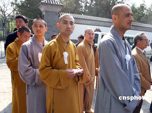图为北京法源寺僧侣佩带白花出席追悼会。