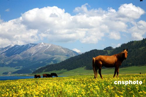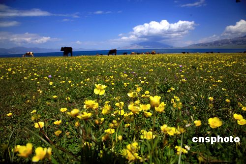 2007年5月下旬以来,五颜六色的花朵把新疆赛里木湖装扮得格外美丽,赛里木湖进入黄金旅游季节。据当地人介绍,赛里木湖盛开的鲜花一直可以保持到6月中下旬。赛里木湖又名三台海子,是新疆最大的高山湖泊,位于博尔塔拉蒙古自治州州府博乐市西南,周围为塔尔钦斯凯山区。湖面海拔2073米。它东西长约20公里,南北宽约30多公里,面积450多平方公里,水深处可达90米。湖略呈卵圆形,是一周围封闭的内陆湖。中新社发 胡维斌 摄