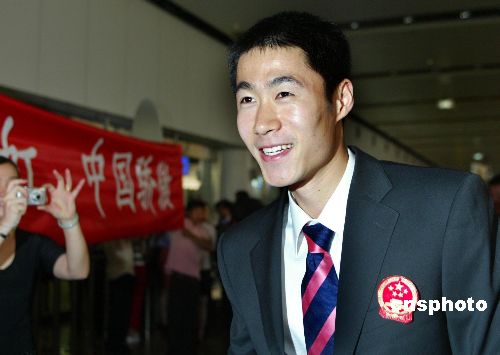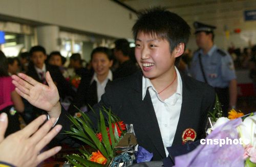 5月29日,在第49届单项世乒赛上包揽全部五个单项的冠亚军的中国乒乓球队返回北京,在首都机场受到了热烈的欢迎。中新社发 杜洋 摄