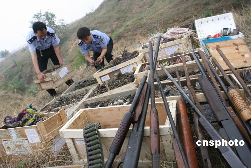 5月30日,郑州治安民警在现场清理并准备销毁收缴的大批枪支弹药和爆炸物品。当日,郑州市公安局治安支队将在今年五月份以来开展的“全市治爆缉枪专项行动”中收缴查缉的违禁枪支26支;子弹16000发;炸弹31枚;雷管41000枚予以销毁。销毁工作在郑州西部山区安全进行。中新社发 刘书亭 摄
