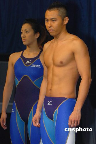 6月1日下午,日本著名运动服装品牌“美津浓”举行今夏新款泳装发布会,日本著名男子游泳名将北岛康介加盟助兴,在T台上也秀了一回。中新社发 滕剑峰 摄