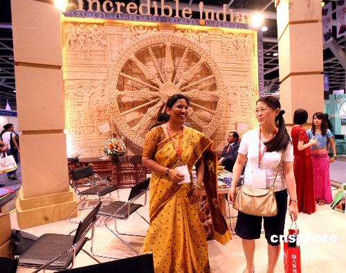 印度旅游业界人员身穿民族服装在其设置的充满神秘而古老的展台前接待参观者,展台上摆满奇异风光资料和瑜伽休闲光碟,每一样元素度散发印度独特的风情。