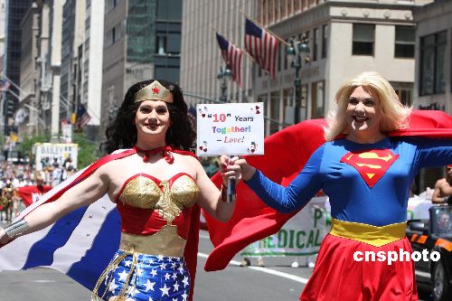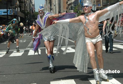六月二十四日,同性恋大游行在纽约曼哈顿第五大道举行,参加者尽情展示奇异装扮、劲歌热舞,以期引起社会对同性恋的更多关注。 中新社发 谭宏伟 摄