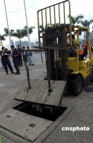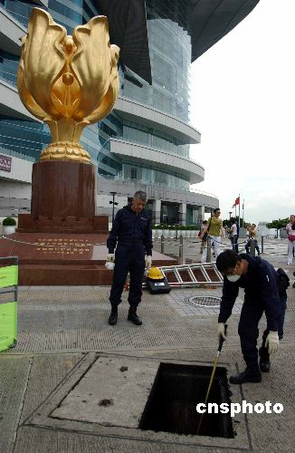 国家主席胡锦涛将于29日抵港,出席香港回归十周年的庆祝活动。27日,香港警方在金紫荆广场及会展中心一带进行保安检查。中新社发 谭达明 摄