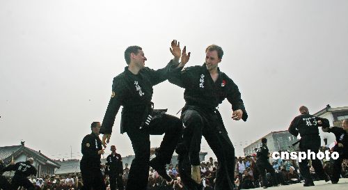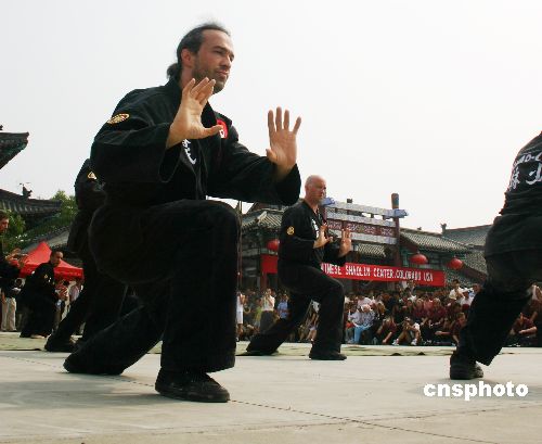 | 6月29日,在山东省阳谷县狮子楼前,来自美国的武术爱好者进行太极拳表演。当日,美国科罗拉多州少林武术中心的近100名武术爱好者来到素有“武术之乡”美称的山东省阳谷县进行武术交流。他们与这里的民间武术爱好者在狮子楼景区前进行武术交流表演。双方表演了太极拳、八卦掌、中华棍术、刀术等精彩项目。近年来,随着中国文化的广泛传播,在许多国家都掀起了中国功夫热,各国的武术民间团体或个人纷纷前来学习中国武术。中新社发 肖明磊 摄