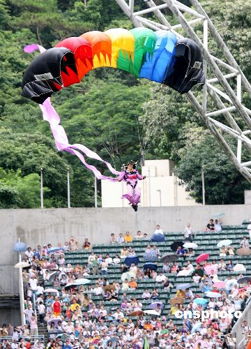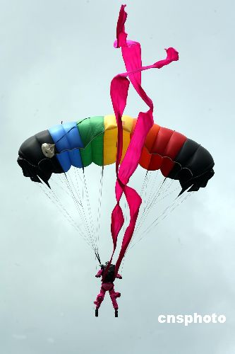 七月二号,“雄鹰翱翔庆回归”在香港大球场进行,解放军驻港部队三军仪仗队、解放军八一跳伞队、青海文艺表演队等表演多个精彩节目,数万香港市民冒烈日观看,阵阵掌声回荡。图中曾获多项国际比赛冠军的解放军八一跳伞队女队员表演“仙女下凡”。中新社发 王丽南 摄