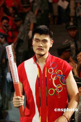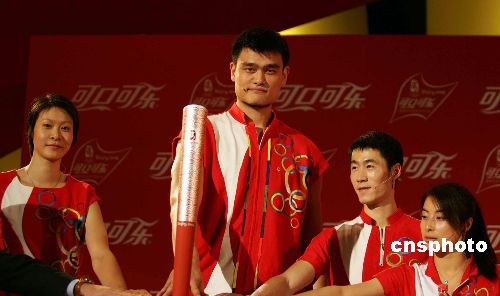 7月3日,中国当今人气最旺的体育巨星姚明、郭晶晶、王励勤和赵蕊蕊等名将,组成豪华的可口可乐公司“奥运星阵容”,在北京推荐他们心目中的北京奥运会火炬手。可口可乐(中国)饮料有限公司决定向中国大众提供1188名火炬手和陪跑手名额,“奥运星阵容”在清华大学体育馆率先提名他们心中奥运火炬手的人选,“谁点燃我心中圣火”的活动由此拉开序幕。中新社发 杜洋 摄