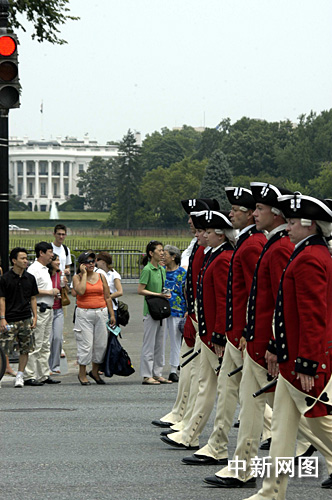 游行队伍身着独立战争时期的服装列队经过白宫。