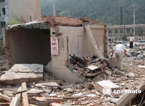 图为爆炸后周围受累的一杂粮店断壁残垣。
