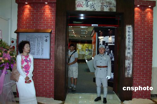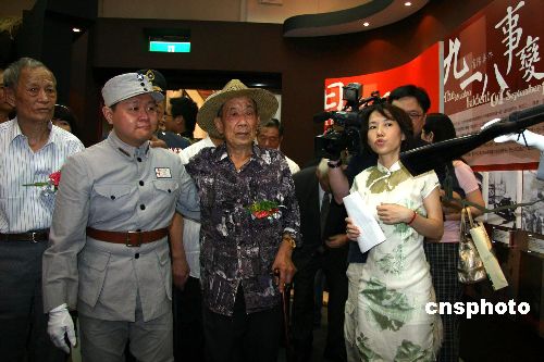 主办者要求解说员(左一)穿着当年的抗战军服陪同曾经参与过抗战的老兵一起参观特展。