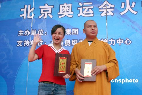 2007年7月7日,河南首批联想奥运提名火炬手诞生,曾在新闻现场奋勇救人的中国最美女记者曹爱文、少林寺武僧团团长释延裕,获得联想集团颁发的提名火炬手证书。中新社发 陈代述 摄