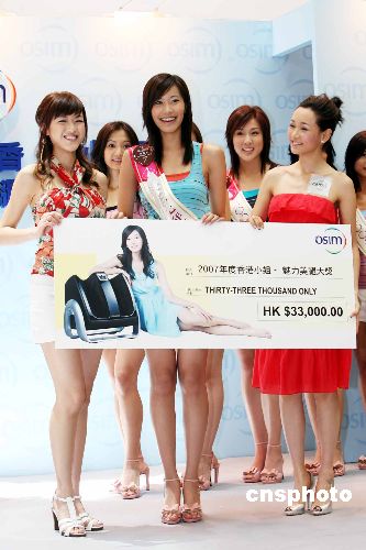 7月9日,参加竞选香港小姐的16名佳丽在新世纪广场登台,以最佳姿势展示双腿动人线条,角逐大会赞助商推出的“魅力美腿大奖”。中新社发 洪少葵 摄