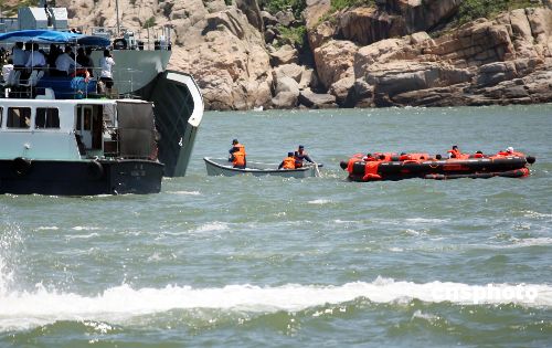 图为救生筏被成功拖到参加救助的驻港部队登陆艇上。