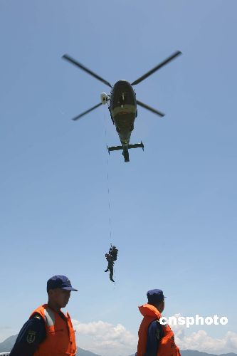 图为直升机将伤员吊送至驻港部队的一艘导弹护卫舰上进行救治。