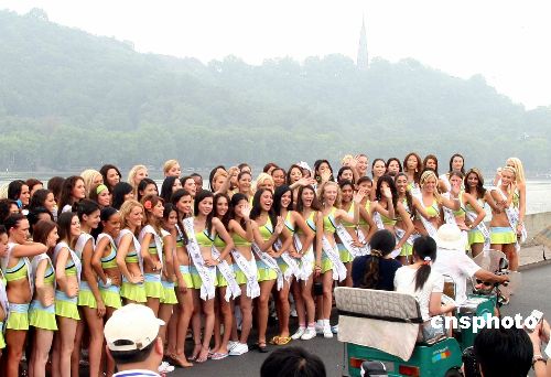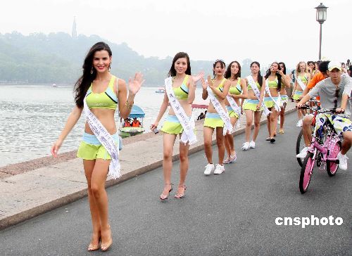 七月十二日,二零零七年国际旅游小姐冠军总决赛参赛选手在杭州“平湖秋月”景点附近与西湖亲密接触,佳丽们在湖边戏水、骑车游憩、与游客交流,为西湖美景平添妩媚。中新社发 刘鹰 摄