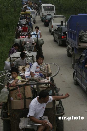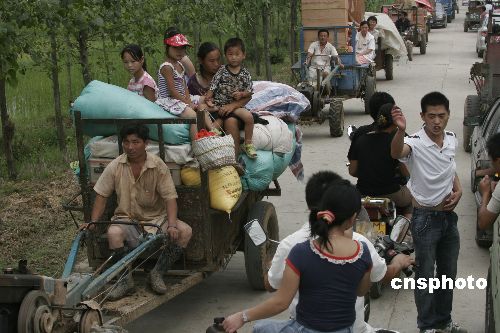 7月19日上午,安徽凤阳沿淮黄湾、枣巷两乡接到让行洪区群众转移的命令后,立刻组织了两万多台农机车辆帮助群众在规定时间内撤离行洪区转移到安全地带。中新社发 汪 强 摄