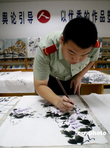 2007年7月下旬,为纪念中国人民解放军建军80周年,浙江省公安边防总队海警第一支队4名酷爱书法绘画的战士聚在一起,共同创作了40余幅书画作品,准备在建军节期间向全支队官兵展出。中新社发 温树茂 摄