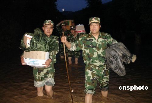 云南临沧市边防官兵涉水为灾民运送救灾物资。