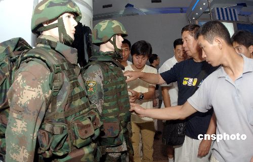 观众对中国军队士兵新装备的作战迷彩服和防弹背心十分感兴趣。