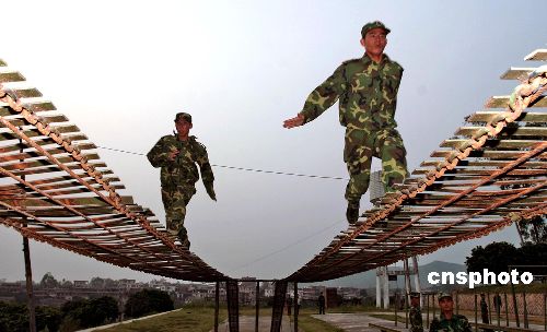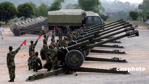 七月三十一日,为庆祝建军节的到来,驻泉州某部队的官兵们特地为当地村民表演了精彩的炮操和越障演练,展示当代军人的风采。中新社发 傅丹丹 摄