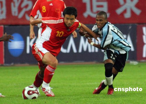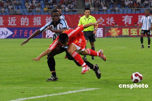 8月1日,在沈阳奥体中心举行的四国邀请赛首轮比赛中,中国国奥队(红衣)坐镇主场迎战博茨瓦纳队,最终凭借着沈龙元和姜宁的进球,以2比0战胜了对手,取得开门红。中新社发 黄金昆 摄