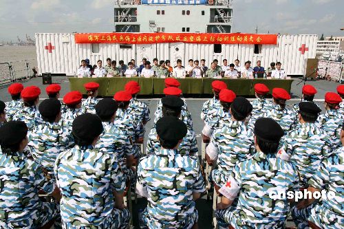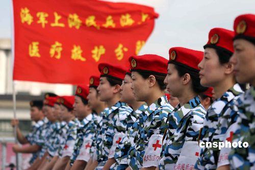 2007年8月8日上午,中国海军上海民兵海上医疗救护分队成立大会在吴淞军港举行。50余名民兵预备役医疗人员参加了授旗仪式,并进行了宣誓。据悉民兵海上医疗救护分队成立旨在加强民兵训练,提高海上民兵卫勤力量,仪式后民兵海上医疗救护分队将进驻海军82号训练舰,并跟随舰艇开始为期三天的海上拉动训练。中新社发 杨向春 摄