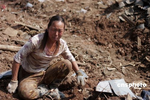 河南卢氏县朱阳关镇朱阳关村村民在自家塌房的瓦砾上扒寻淹埋在废墟中的物品。