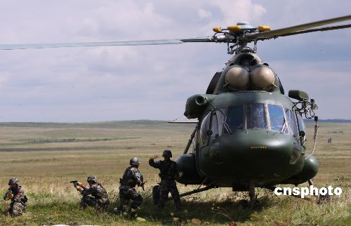 8月9日,“和平使命-2007”联合反恐军事演习正式开始第一天,参加“和平使命-2007”联合反恐军事演习参演国官兵在切巴尔库尔靶场进行多课目、多兵种的反恐训练,六国军队同台交流,陆空力量协同作战。中新社发 张雷 摄