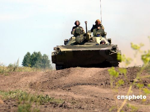 当地时间八月十三日下午,“和平使命-二00七”上海合作组织成员国武装力量联合反恐军事演习,在俄罗斯车里雅宾斯克成功进行实兵总预演,这也是最后一次合练。此次预演严格按照十七日正式军演的程序进行,使用实兵实弹。中新社发 田冰 摄