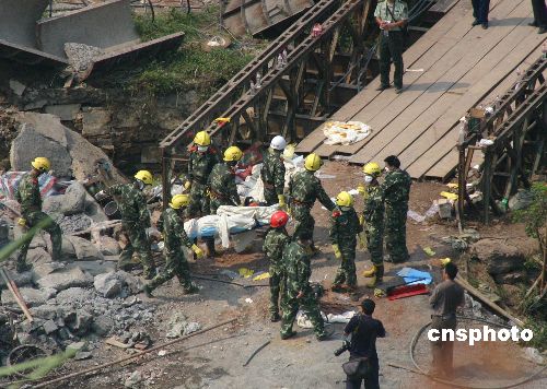 救援人员在湖南省凤凰县凤大公路堤溪段大桥垮塌的事故现场开展抢救。