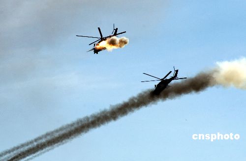 当地时间八月十七日下午,“和平使命-二00七”上海合作组织联合反恐军演在俄罗斯车里雅宾斯克正式举行。成员国参演部队实施地空协同立体作战。中新社发 田冰 摄