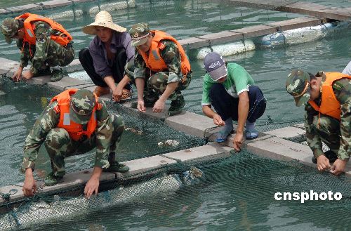 福州罗源边防官兵深入罗源湾海域的渔排帮助海上养殖户对渔排提前进行加固。