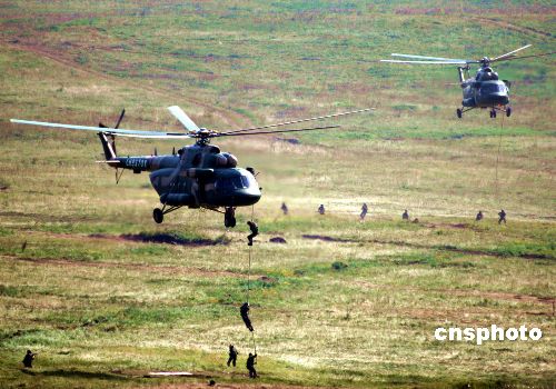 图为中方特战队员实施机降,围捕逃窜的“恐怖分子”。