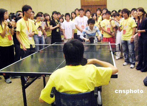 图为邓亚萍与台湾大学残疾学生打乒乓球。