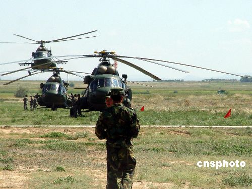 8月24日下午2时10分,参加“和平使命—2007”联合反恐军演的中国陆军航空兵最后16架武装直升机,顺利抵达阿勒泰机场。据了解,数十名陆航队员在阿勒泰机场用餐及给飞机补充油料后返回某基地。这标志着参加“和平使命—2007”联合反恐军演的中方参演部队已全部顺利返回。中新社发 张秀科 摄
