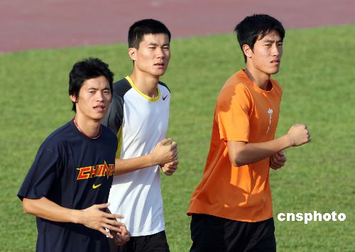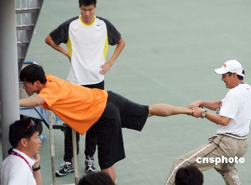 八月二十五日,中国著名一百一十米跨栏选手刘翔与教练孙海平在日本大阪作参赛前的适应训练。刘翔将于本月二十九、三十日、三十一日出赛在该地举行的第十一届世界田径锦标赛。中新社发 毛建军 摄