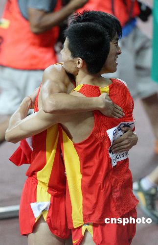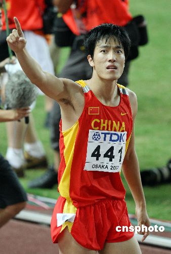 八月三十一日晚,世界纪录保持者、中国选手刘翔在第十一届世界田径锦标赛男子一百一十米栏比赛中,以十二秒九五的成绩夺得金牌,实现世锦赛夺冠夙愿。中新社发 毛建军 摄