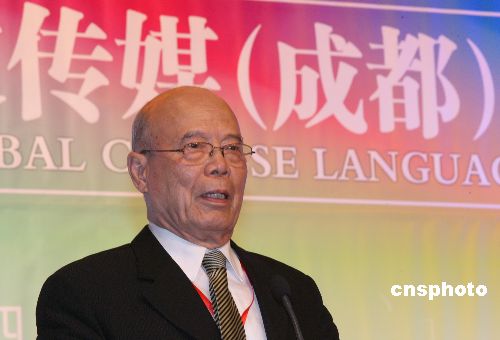 9月3日,正在四川成都举办的第四届世界华文传媒论坛进行大会发言,图为加拿大多伦多《世界日报》原社长丁侃作题为《华文媒体如何协助构建“和谐社会”》的发言。中新社发 张勤 摄