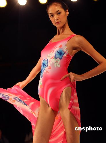 9月9日晚,2007“美丽·三亚”时尚节系列活动首场T台秀“浩沙泳装展示会”在三亚举行,图为参加“2007新丝路中国模特大赛总决赛”的选手展示“浩沙泳装“新款系列作品。中新社发 钱兴强 摄