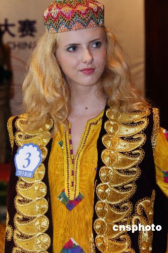 9月20日晚,参加“2007新丝路世界模特大赛总决赛”的选手在江苏无锡举行与媒体见面会,来自世界40多个国家和地区的50名选手集体亮相。图为来自不同国家的参赛选手展示民族服饰。中新社发 钱兴强 摄