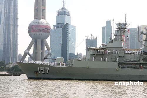 图为“珀斯”号护卫舰驶经上海标志性建筑东方明珠塔。