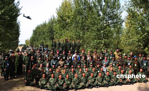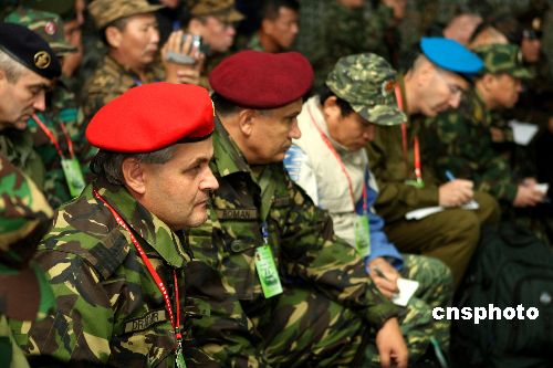 中国人民解放军沈阳战区9月25日举行“勇士-2007”摩托化步兵师进攻战斗实兵实弹演习,应邀观摩演习的上合组织和东盟成员国以及美、英、法等35个国家的55名军事观察员,在演习导演室听取演习情况介绍。据悉这是近几年来,解放军演习邀请外国军事观察员最多的一次。中新社发 宋吉河 摄