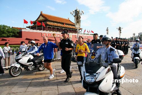 图为由北京特警总队警察组成的执法人员火炬跑队伍。