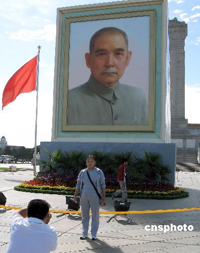 在中华人民共和国五十八周年国庆前夕,孙中山先生巨幅画像被摆放在北京天安门广场中央。九月二十七日,广场游人纷纷站在孙中山先生像前留影纪念。中新社发 邹宪 摄